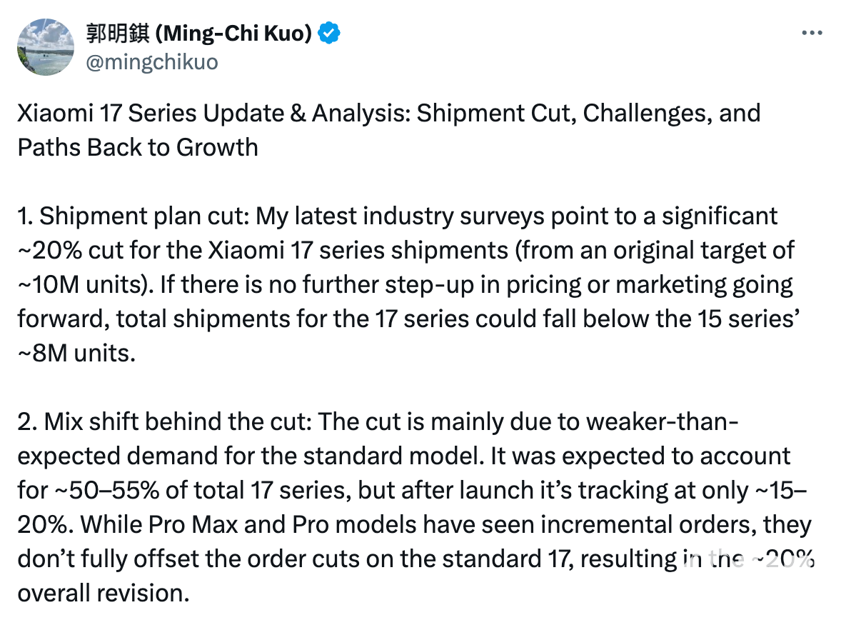 郭明錤调查发现,小米17系列的出货量将大幅下降约20%(原定目标约为1000万台)。如果未来定价或市场营销没有进一步提升,17系列的总出货量可能会低于15系列的约800万台。