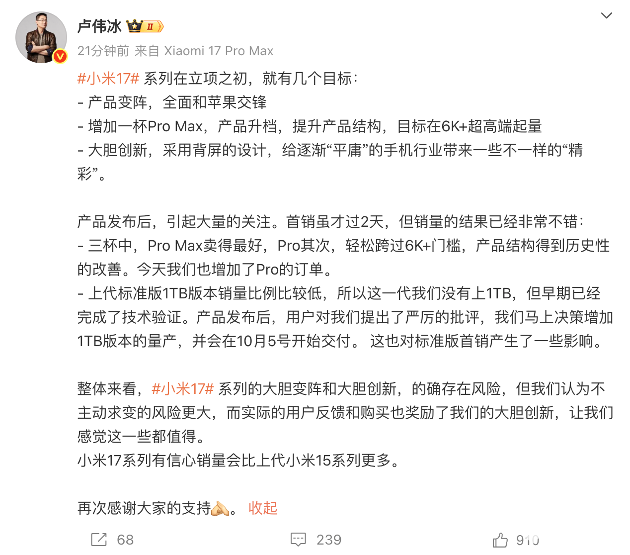 2025年9月29日,小米集团合伙人、总裁,手机部总裁,小米品牌总经理卢伟冰发文称,小米17系列首销虽才过2天,但销量的结果已经非常不错。