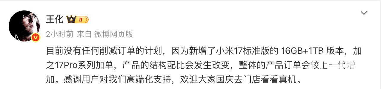 随后,小米公关负责人王化在社交媒体平台发文称,目前小米17系列没有任何削减订单计划,因为新增小米17标准版的16GB+1TB版本,加之17 Pro系列加单,产品的结构配比会发生改变,整体的产品订单会较上一代增加。