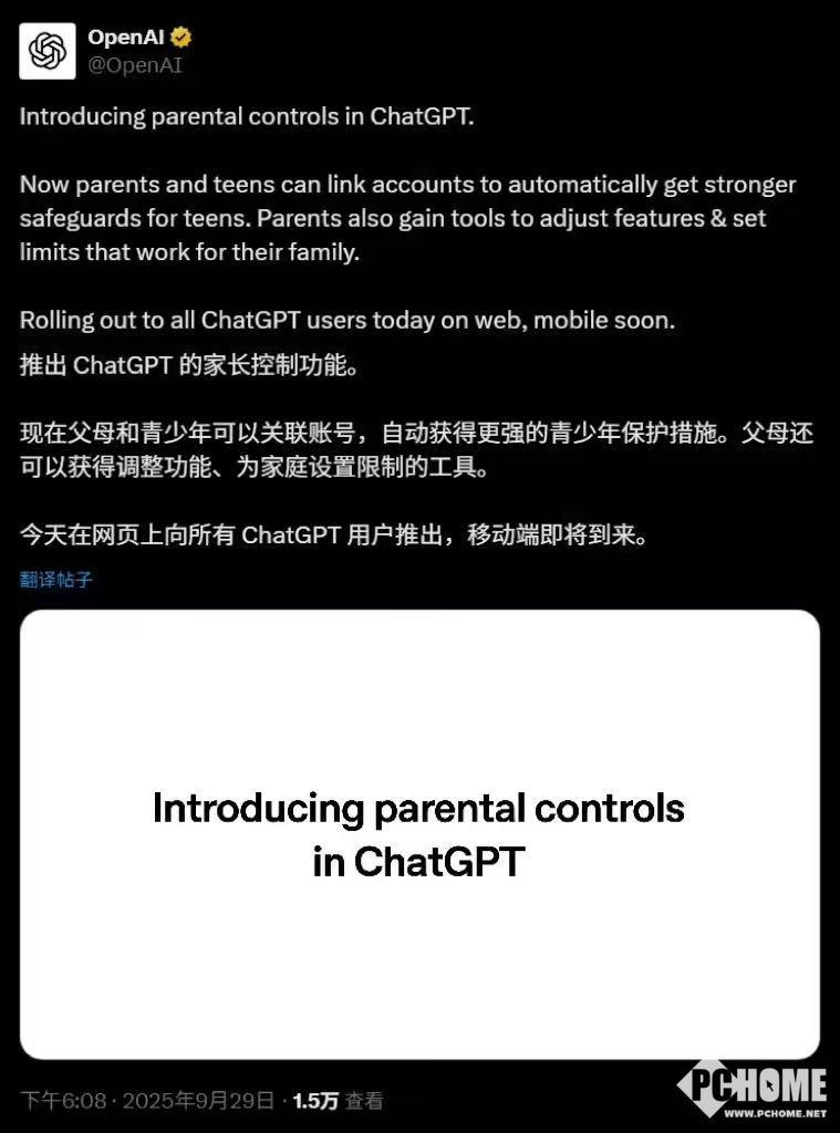 9月29日,OpenAI正式宣布推出ChatGPT家长控制功能,网页端已全面上线,移动端支持即将跟进。该功能允许家长与青少年账户关联,通过多重设置强化未成年人使用安全,此举被视作对青少年心理健康争议的回应。