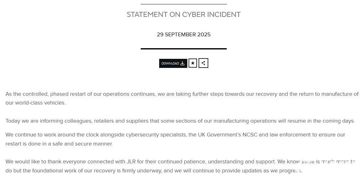 9月29日,捷豹路虎发布官方声明,宣布受网络攻击中断的部分制造业务将于未来数日内逐步恢复,标志着这场持续超一个月的生产危机迎来转机。