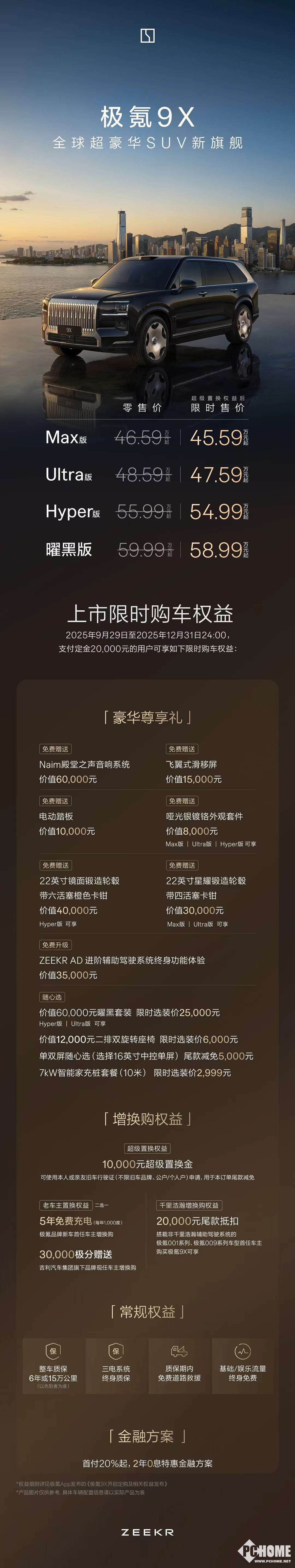 售价方面,极氪9X共推出Max版、Ultra版、Hyper版、曜黑版四个版型,官方零售价分别为46.59万元起、48.59万元起、55.99万元起、曜黑版59.99万元起。同时,还有10000元超级置换金,享受上市限时购车权益。超级置换权益后限时售价分别为45.59万元起、47.59万元起、54.99万元起、58.99万元起。