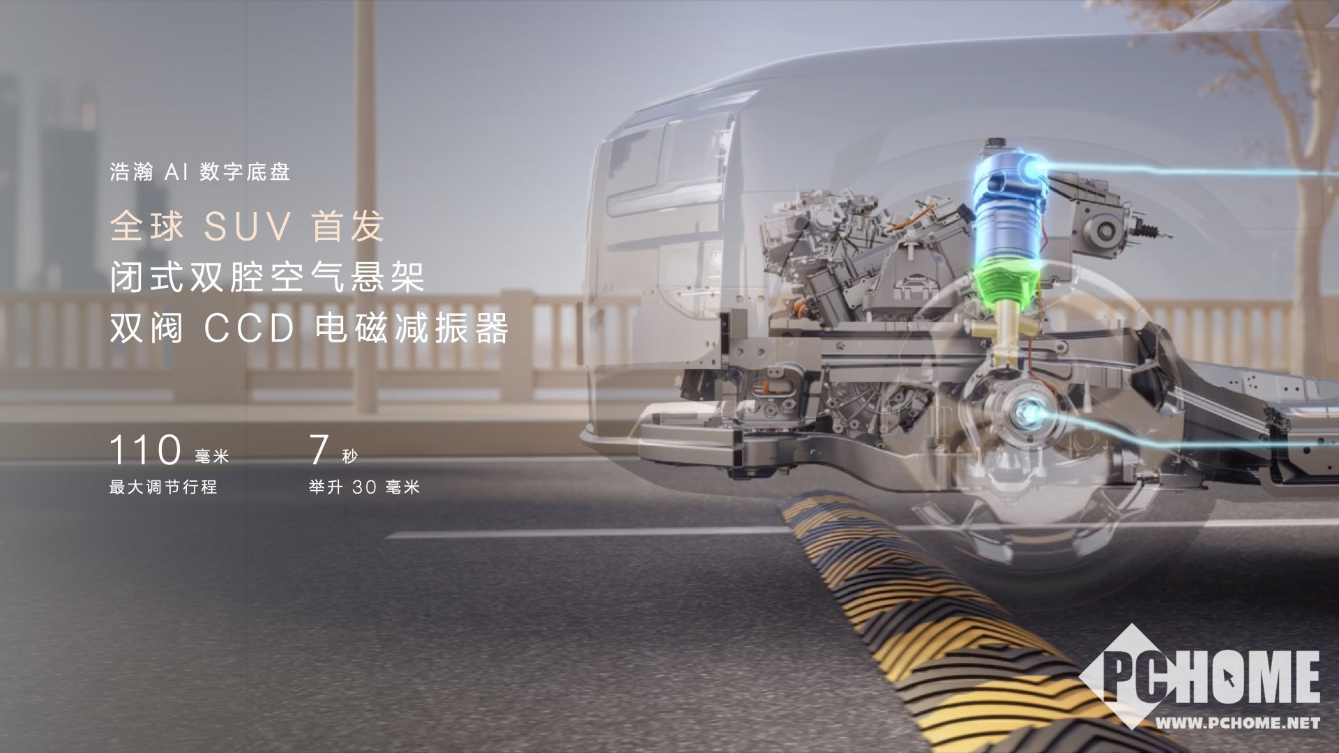 极氪9X首发搭载浩瀚AI数字底盘,全系标配闭式双腔空气悬架+双阀CCD电磁减振器,搭载的48伏主动稳定杆技术,可在0.2秒内完成最高80毫米的举升,有效抑制车身晃动与侧倾,动态表现接近“零侧倾”。