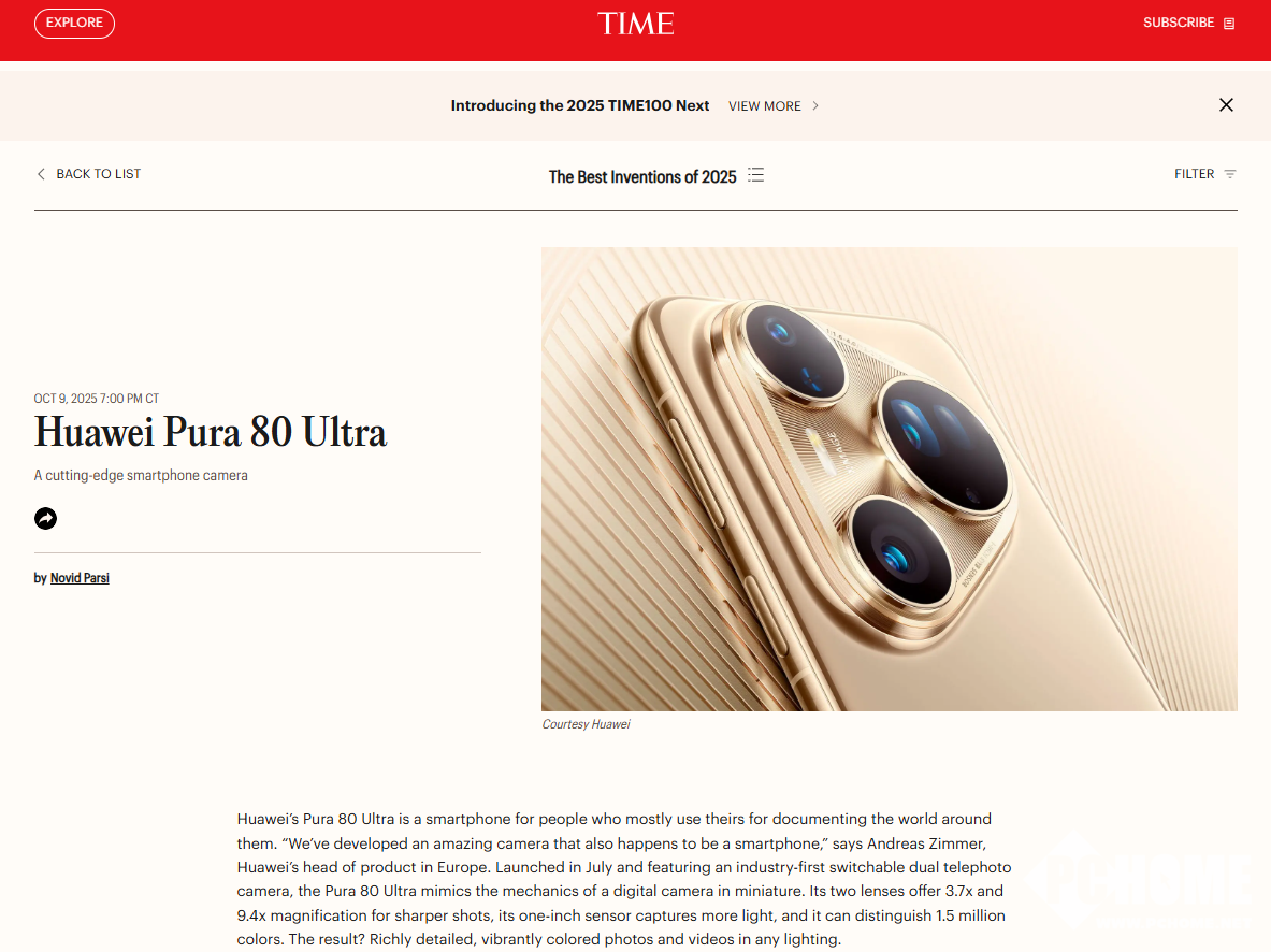 在消费电子榜单上,《时代》周刊评价,华为Pura 80 Ultra是一款专为用手机记录生活的人设计的智能手机,华为欧洲区产品负责人Andreas Zimmer称,我们推出了一款令人惊叹的相机,而它恰好也是一款智能手机。