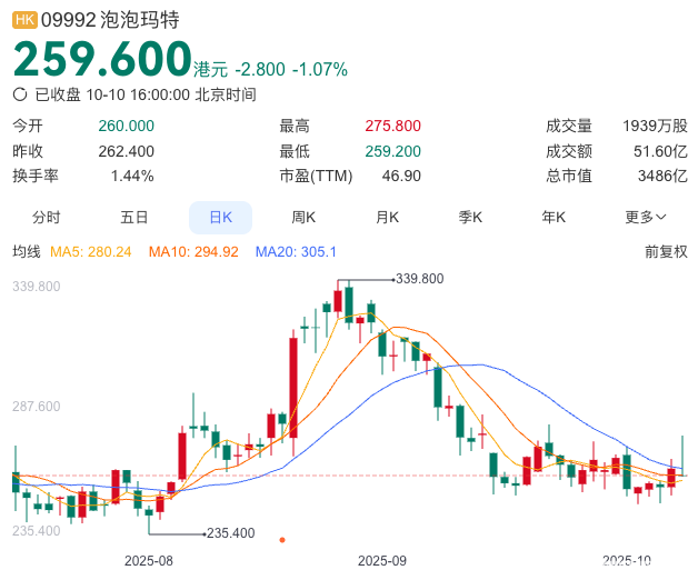 虽然新隐藏款玩偶热潮,但近期泡泡玛特的股价却表现不佳,截至10月10日,报收259.6港元/股,较八月末339.8港元/股的高点下跌23.4%。