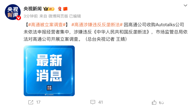 2025年10月10日,央视新闻报道,因收购Autotalks公司未依法申报经营者集中,高通公司涉嫌违反《中华人民共和国反垄断法》,市场监管总局依法对其开展立案调查。