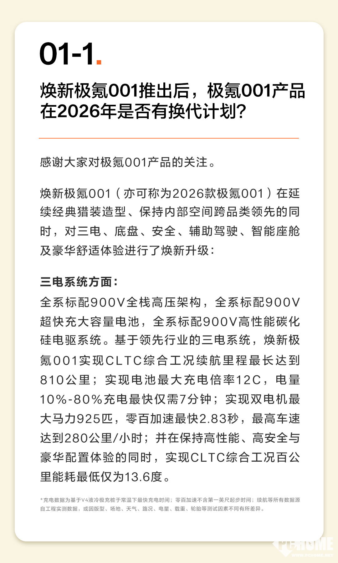 2025年10月10日,极氪官微发布《焕新极氪001答网友问(第2期)》,回应市场关切:2026年极氪001没有换代计划。官方表示,即将于10月11日发布的焕新极氪001已完成三电、底盘、智能座舱等全方位升级,凭借强大软硬件能力可长期保持技术领先性。