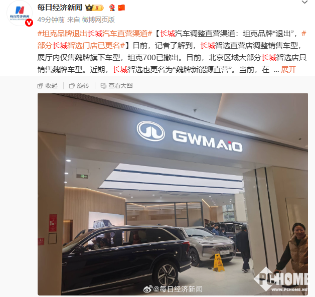 2025年10月10日消息,据每日经济新闻,长城汽车直营门店“长城智选”,正在逐步变更为“魏牌新能源直营店”,将成为长城汽车唯一直营品牌,门店逐步撤出在售的坦克品牌车型,未来将专卖魏牌旗下车型。