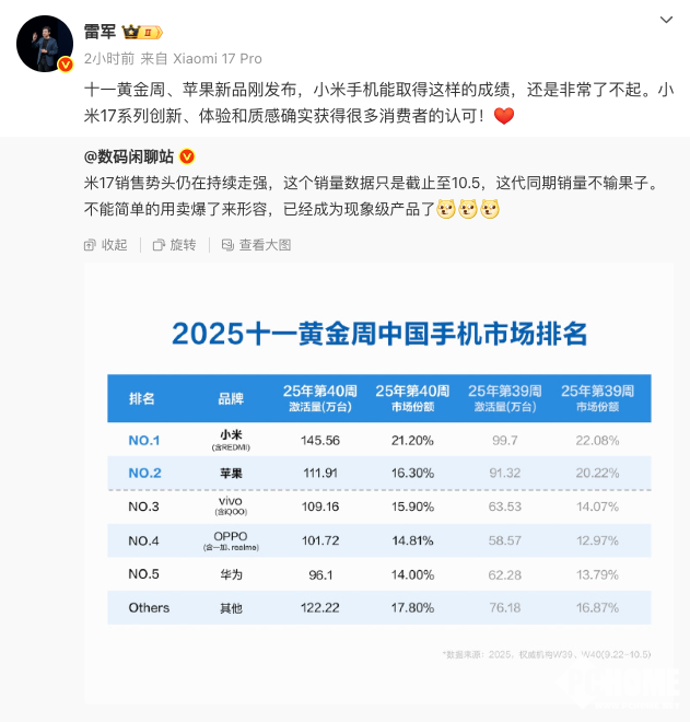小米创办人,董事长兼CEO雷军点评称,“十一黄金周、苹果新品刚发布,小米手机能取得这样的成绩,还是非常了不起。小米17系列创新、体验和质感确实获得很多消费者的认可。”