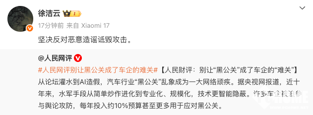 对此,小米集团董事长特别助理、战略市场部副总经理徐洁云转发并表示:“坚决反对恶意造谣诋毁攻击。”