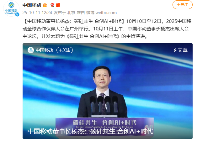 2025年10月11日消息,2025中国移动全球合作伙伴大会在广州举行,中国移动董事长杨杰出席大会主论坛,并发表题为《碳硅共生 合创AI+时代》的主旨演讲。在AI加速科技变革的趋势方面,他大胆预测表示,硅基个体规模将远超人类,形成新的“人才红利”、出现新的“360行”。