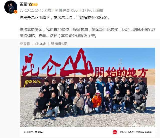 据雷军发文称,在昆仑山脚下,帕米尔高原平均海拔4000多米。这次高原测试,有20多位工程师参与,测试项目比较多,如测试小米YU7高原续航、充电、防晒(高原紫外线很强)等。