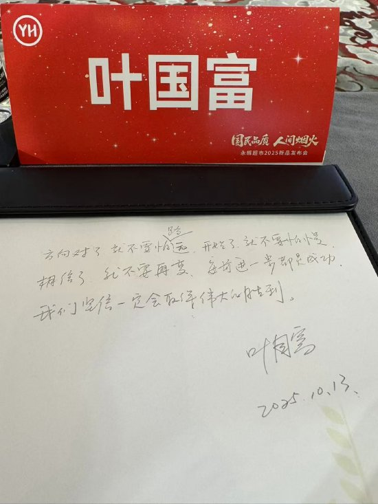 据新浪科技报道,名创优品创始人、董事会主席兼首席执行官,永辉超市非独立董事、改革领导小组组长叶国富出席发布会,并且在会议纸上写道:“方向对了,就不要怕路远。开始了,就不要怕慢。相信了,就不要再变。每前进一步都是成功,我们坚信一定会取得伟大的胜利。”