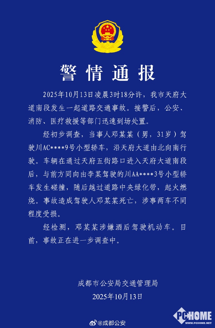 对此,成都市公安局交通管理局发布通告称,邓某某(男,31岁)驾驶川AC****9号小型轿车,沿天府大道由北向南行驶。与前方同向小型轿车发生碰撞,起火燃烧。事故造成驾驶人邓某某死亡。经检测,邓某某涉嫌酒后驾驶机动车。