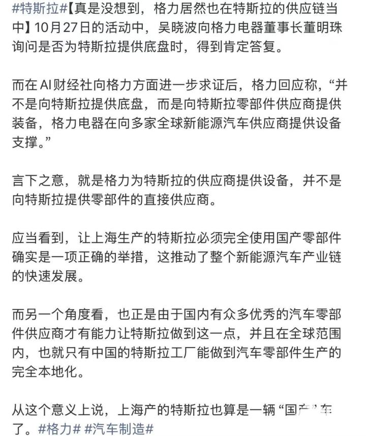 此次董明珠的公开确认,实则是对长期合作的披露。早在2022年,董明珠就曾回应称格力为特斯拉零部件制造提供装备支撑,涉及底盘制造等环节。2025年4月更有信息显示,格力通过子公司珠海格力智能装备有限公司,为特斯拉提供工业机器人及自动化生产线,其六轴联动加工中心精度达±5μm。此次官宣进一步证实双方合作已进入稳定深化阶段。
