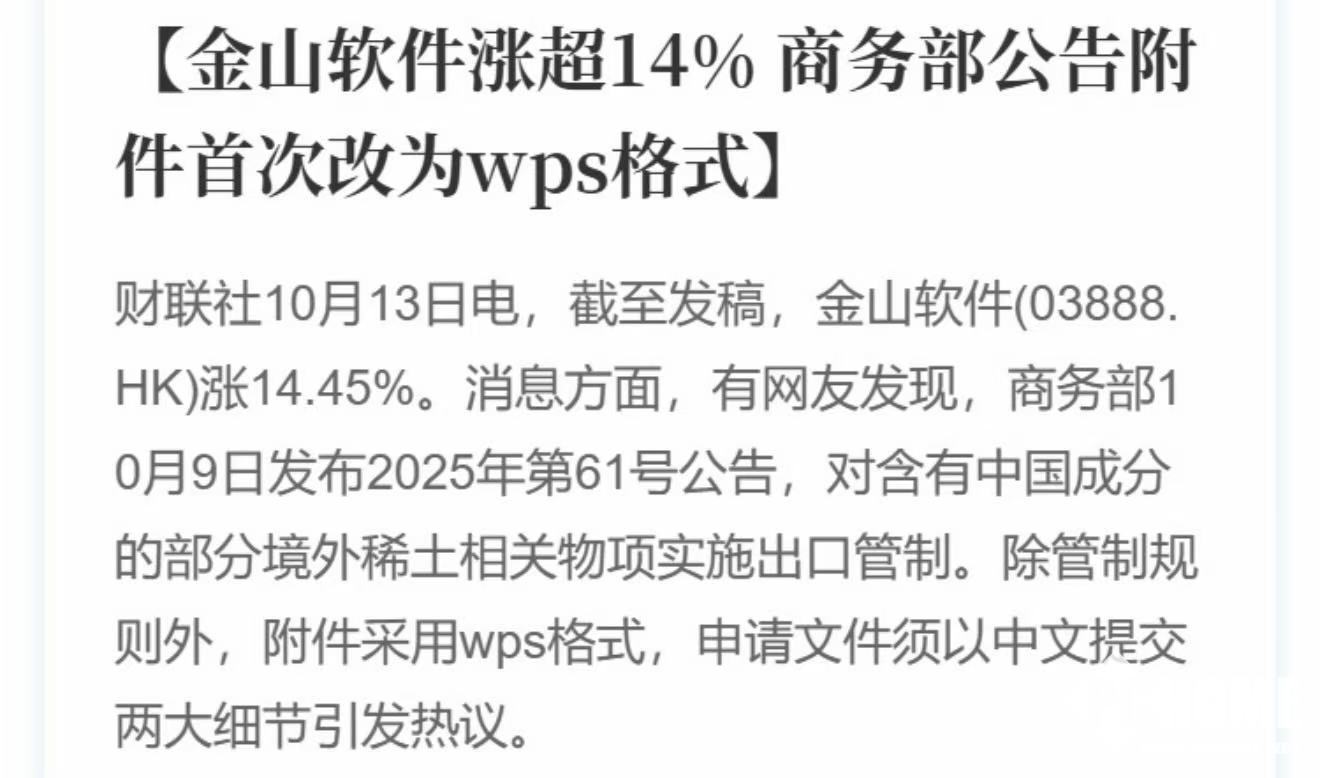 10月13日,港股金山软件股价开盘后快速拉升,盘中最高涨幅近19%,最终收涨13.51%,报36.46港元/股。A股金山办公同步走强,一度涨超18%。股价异动源于10月9日商务部发布的稀土出口管制公告,其附件首次弃用微软DOC与PDF格式,全面采用WPS格式。这一打破多年惯例的调整,被市场解读为国产办公软件获官方认可的强烈信号,直接点燃投资者对金山软件的信心。