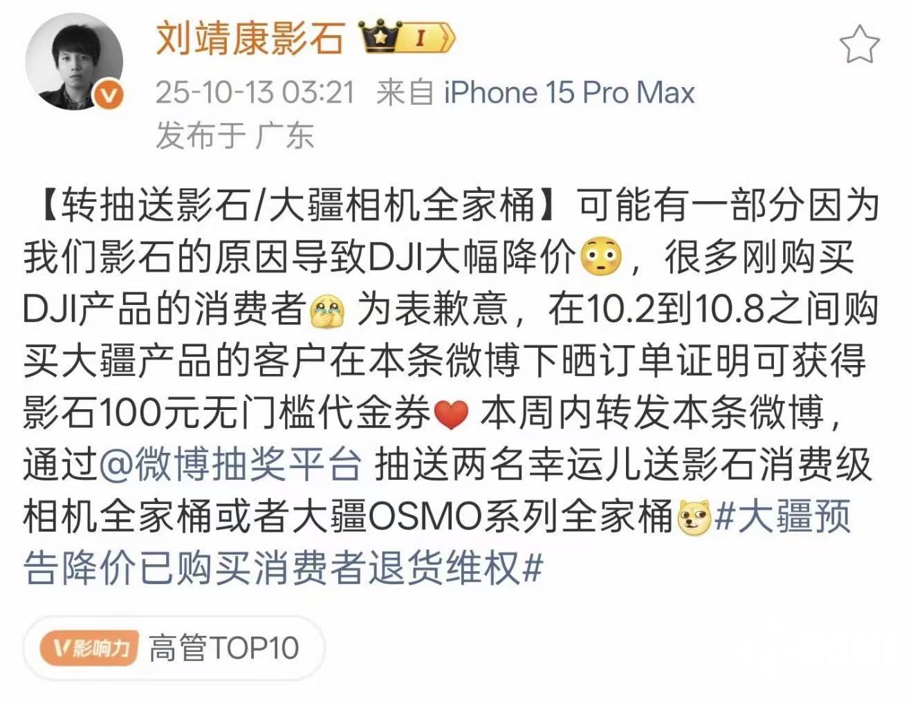 10月13日,影石创新CEO刘靖康在微博引发热议,通过“认责式”互动,公开表示:“可能有一部分我们影石的原因导致DJI大幅降价”。