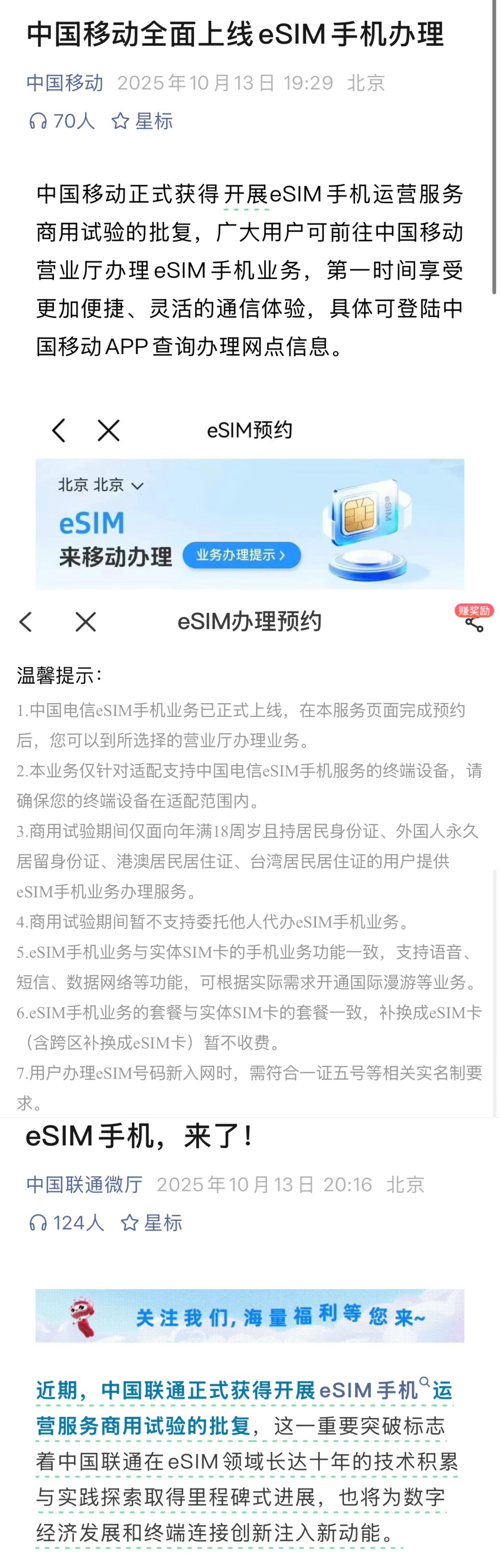近日,中国移动、中国联通、中国电信三大运营商先后宣布,正式获得开展eSIM手机运营服务商用试验的批复,eSIM手机业务预约网页均已上线。
