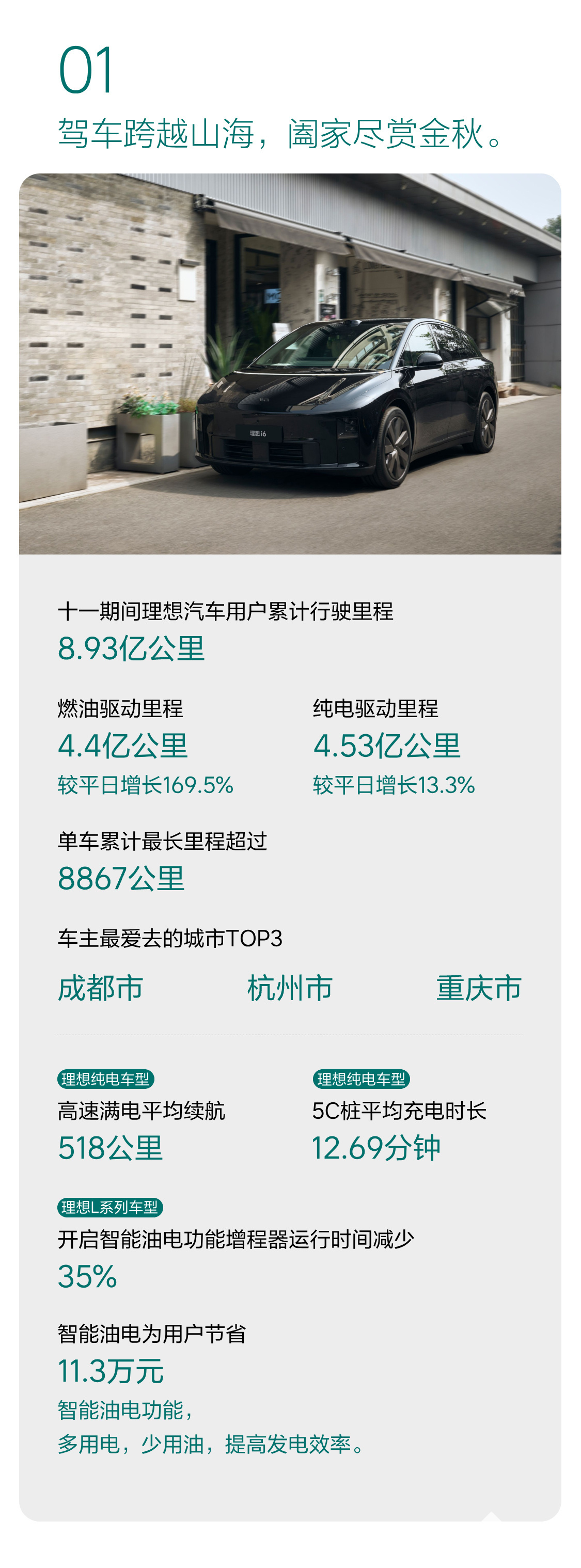 细节方面,假期期间理想汽车用户累计行驶里程达8.93亿公里,其中燃油驱动里程4.4亿公里,较平日增长169.5%;纯电驱动里程4.53亿公里,较平日增长13.3%。从目的地来看,车主最爱去的城市 TOP3 分别是成都市、杭州市、重庆市,这三座城市或有着秀丽的自然风光,或有着独特的人文底蕴,成为理想汽车用户金秋出行的心头好。