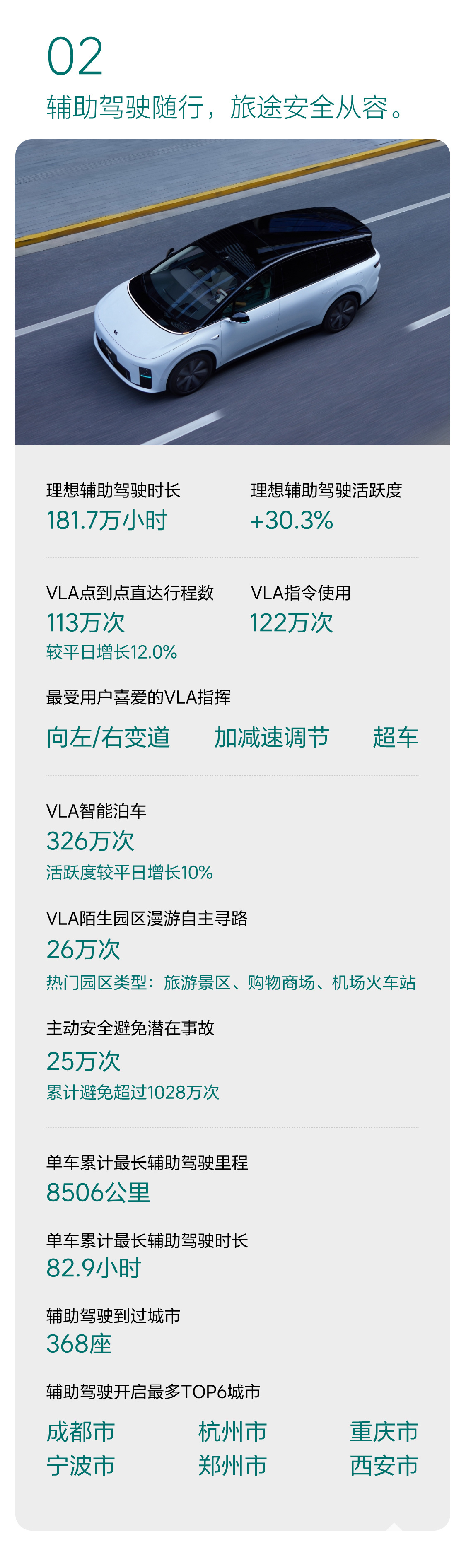 在智能驾驶功能应用方面,VLA点到点直达行程数达113万次,较平日增长12.0%;VLA指令使用122万次,其中最受用户喜爱的VLA指挥功能包括向左/右变道、加减速调节、超车,精准满足用户多样驾驶场景需求。VLA智能泊车次数达326万次,活跃度较平日增长10%;VLA 陌生园区漫游自主寻路26万次,热门园区类型涵盖旅游景区、购物商场、机场火车站等,为用户在复杂场景下的出行提供智能助力。
