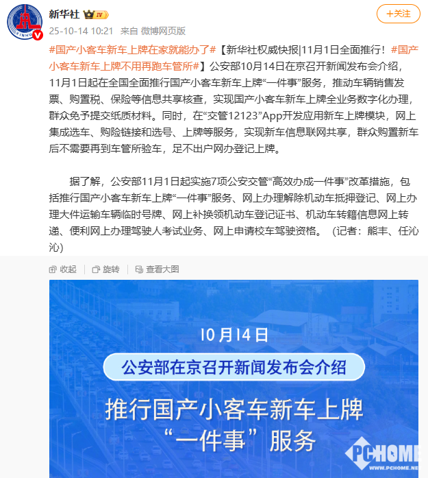 2025年10月14日消息,新华社消息,公安部在北京召开新闻发布会介绍,11月1日起,在全国全面推行国产小客车新车上牌“一件事”服务,实现国产小客车新车上牌全业务数字化办理,购置新车后将不再需要到车管所验车,即可足不出户网上办理新车登记上牌等。