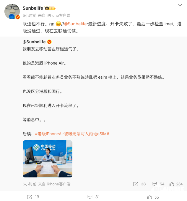 2025年10月14日,博主“Sunbelife”爆料称,朋友拿着港版iPhone Air去移动营业厅碰运气,想使用内地eSIM。