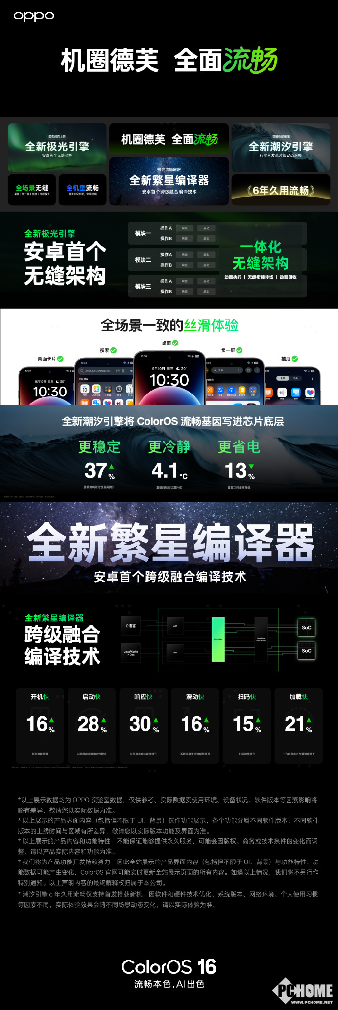 据介绍,全新ColorOS 16三项关键自研技术,全新一代极光引擎、全新一代潮汐引擎和全新自研繁星编译器,实现全面流畅。OPPO AI带来全新战略,提出“新计算、新感知、新生态”的方向。