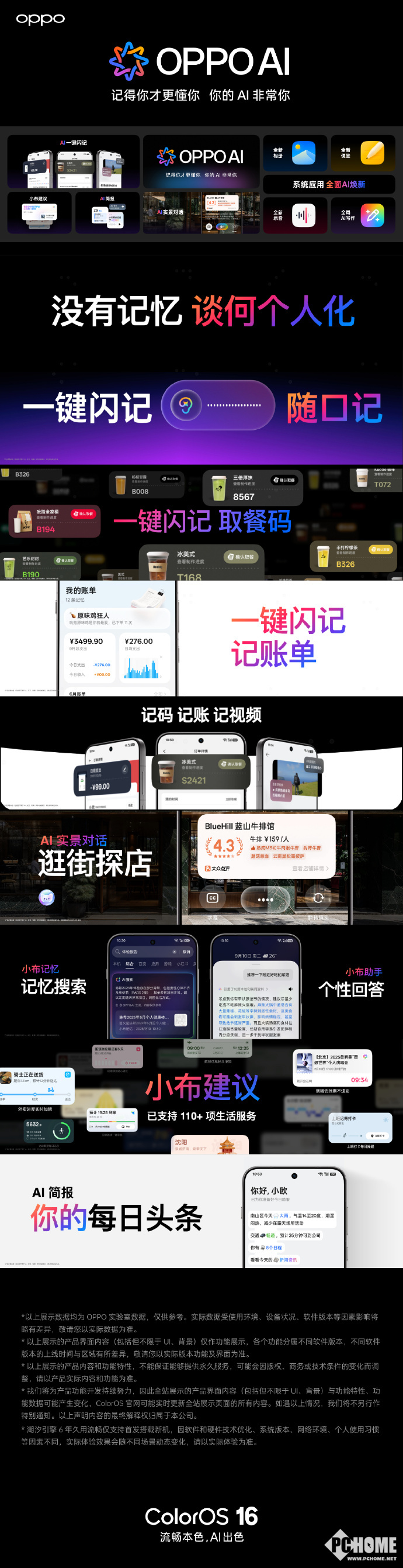 OPPO AI应用全面焕新,“一键闪记”升级后,支持记多图,记视频,随口记、记账单、记取餐码等。“小布建议”支持110多项实用功能,全面打通小布记忆。“AI实景对话”可以识别专属声纹,嘈杂环境下也能听清指令。此外,还有AI人像补光、全局AI写作、全新便签、全新设计相册等,系统AI应用全面焕新。