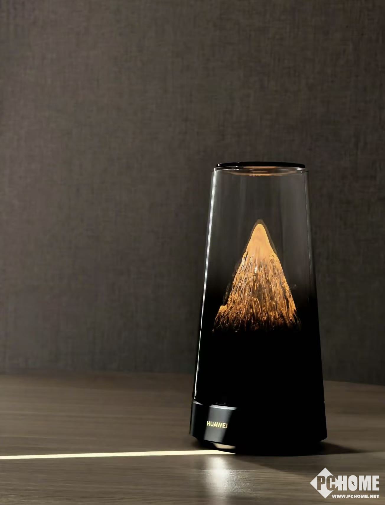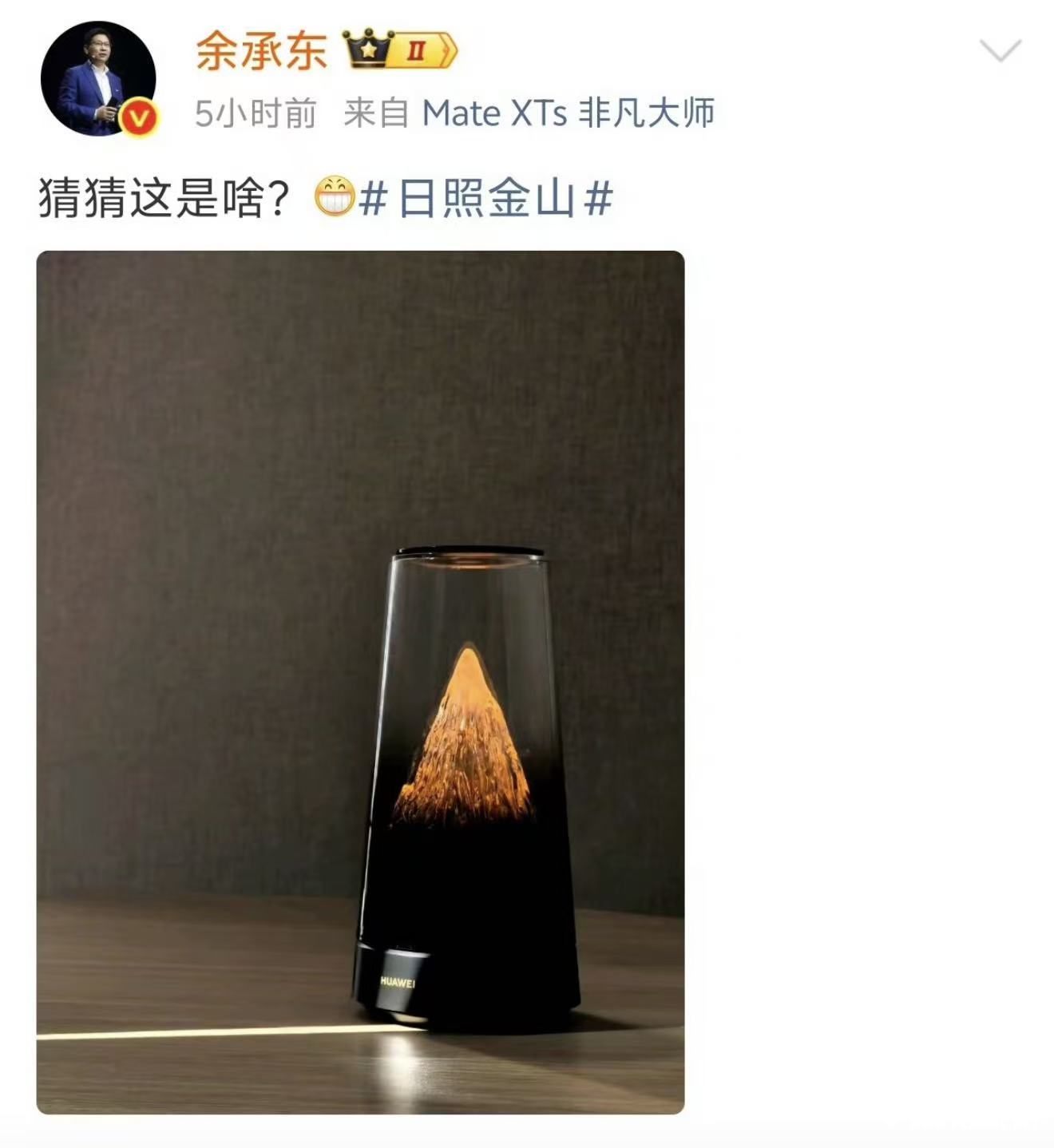 2025年10月15日,华为余承东在个人社交媒体发布神秘新品图,配文“猜猜这是啥?日照金山”,瞬间引爆热议。图片中产品采用透明上盖设计,内部呈现金色山体光影,搭配黑色底座与华为标识,“日照金山”的视觉意象极具辨识度。