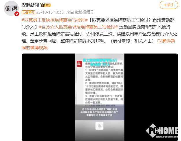 2025年10月15日消息,据澎湃新闻,近日,国产运动品牌匹克启动全员阶梯式降薪,降薪幅度10%至50%不等。有匹克员工反映,公司向拒绝降薪的员工发出《薪资停发告知函》的通知,要求10月14日前交“反思检讨”,否则停发9月份工资。目前,福建泉州相关部门已经介入处理。