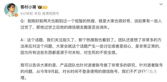 2025年10月15日,微信员工“客村小蒋”在社交媒体平台表示,“产品团队也针对逝者账号做了非常多的研究,针对逝者账号的问题,从今年9月起,对长时间不登录使用的微信账号,我们不再进行回收处理。”