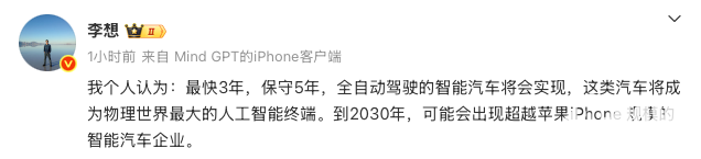 2025年10月15日,理想汽车CEO李想在社交媒体平台发文称,“我个人认为:最快3年,保守5年,全自动驾驶的智能汽车将会实现,这类汽车将成为物理世界最大的人工智能终端。”李想强调,到2030年,可能会出现超越苹果iPhone规模的智能汽车企业。
