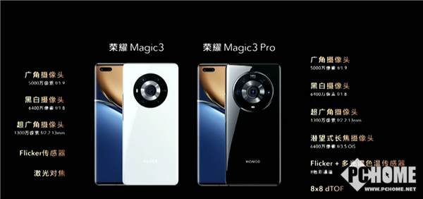Magic3 Pro是四摄,其中Magic3 Pro是5000万像素主摄、6400万像素黑白、6400万像素长焦及1300万像素广角微距,多出来的长焦镜头支持OIS光学防抖,3.5倍光学变焦、10倍混合变焦,100倍数字变焦,而对焦升级为8x8 dToF激光对焦,实现了更大范围的精准对焦。