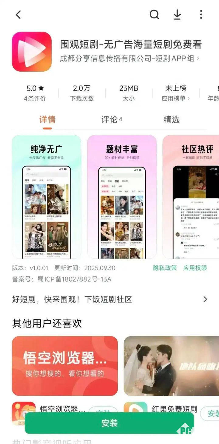 2025年10月16日消息,据小米应用商店显示,一款名为“围观短剧”的独立短剧APP正式上线小米应用商店,开发者为成都分享信息传播有限公司。围观短剧宣传称,无广告海量短剧免费看,目前仅小米手机、红米手机用户可以在小米应用商店下载使用,下载次数显示为3.4万。