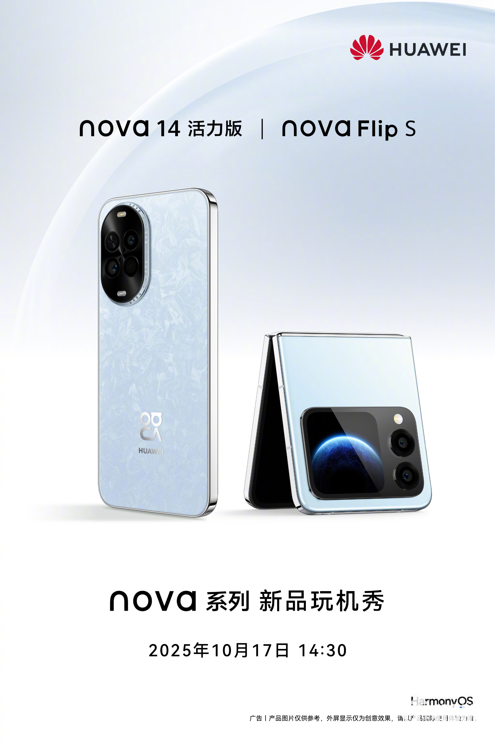 2025年10月16日,华为终端官微发布消息称,华为nova 14活力版及华为nova Flip S新品玩机秀将于10月17日14:30举办。