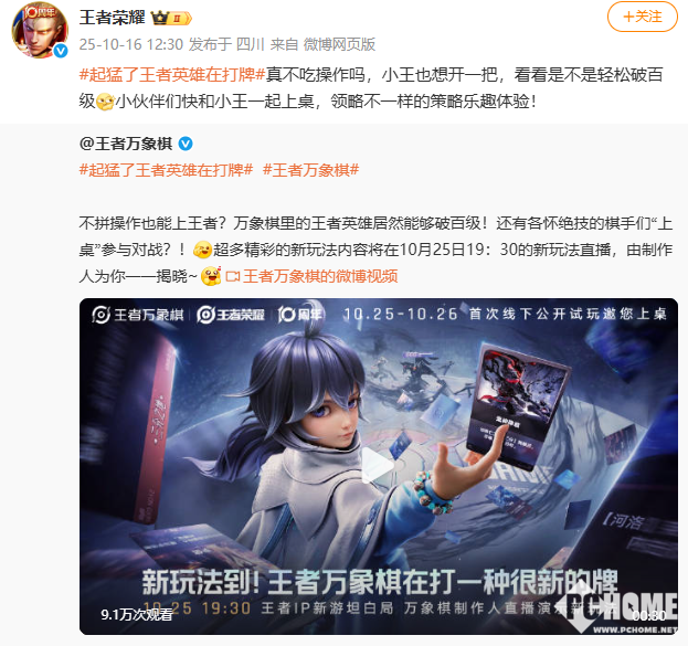 2025年10月16日消息,腾讯游戏旗下王者荣耀官方账号发文预告,《王者荣耀》IP衍生游戏,策略类自走棋游戏——《王者万象棋》即将与玩家见面,《王者万象棋》游戏的制作人,将于10月25日19:30直播新游戏的全新玩法解析。