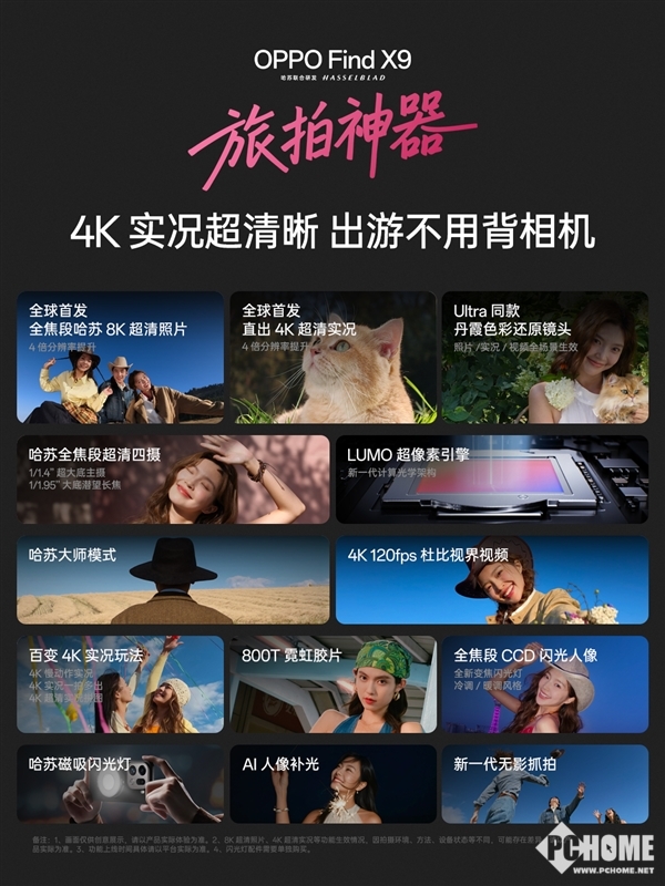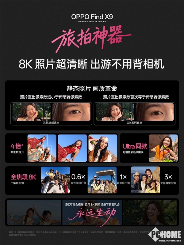 据了解,OPPO Find X9带来新一代计算光学架构LUMO超像素引擎,打破传感器算力限制,默认就有高像素与好画质。OPPO Find X9全系还搭载Ultra级丹霞色彩还原镜头,让8K照片从细节到色彩全面领先,前期随心拍、后期随心裁,人景皆美,旅拍尽兴,成为名副其实的旅拍神器。