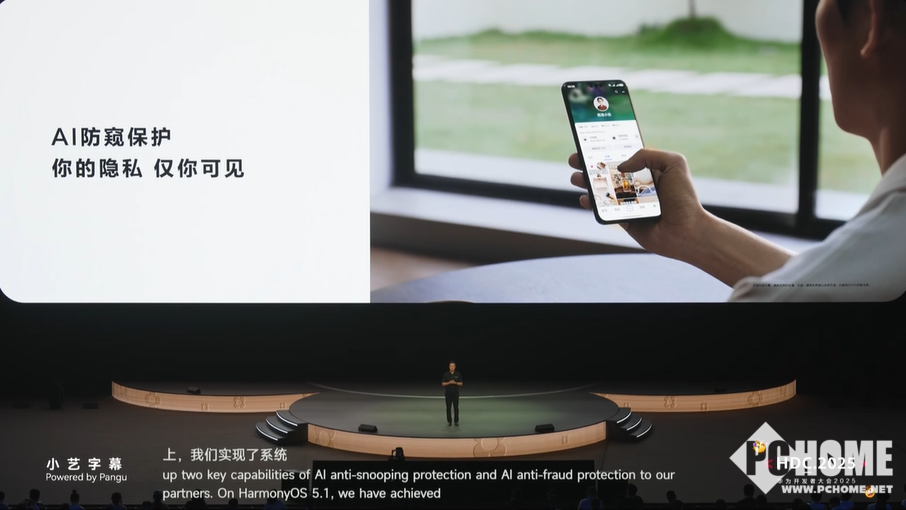主动式AI防护方面,HarmonyOS 6系统会将防窥与防诈功能开放给第三方应用,防窥可以通过摄像头检测查看手机的人是否为机主,检测到陌生人观察屏幕时,就会对用户进行提示,并能直接隐藏整个屏幕或部分隐藏敏感内容。防诈能通过AI主动24小时防护,精准识别各种典型诈骗套路。