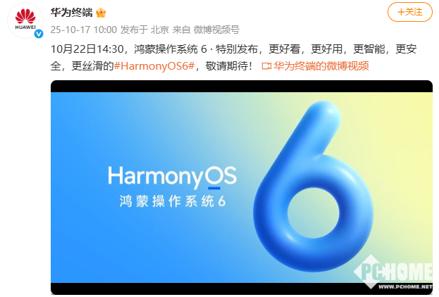 2025年10月17日消息,华为终端官方发文,10月22日14:30,鸿蒙操作系统6特别发布,更好看,更好用,更智能,更安全,更丝滑的HarmonyOS 6。