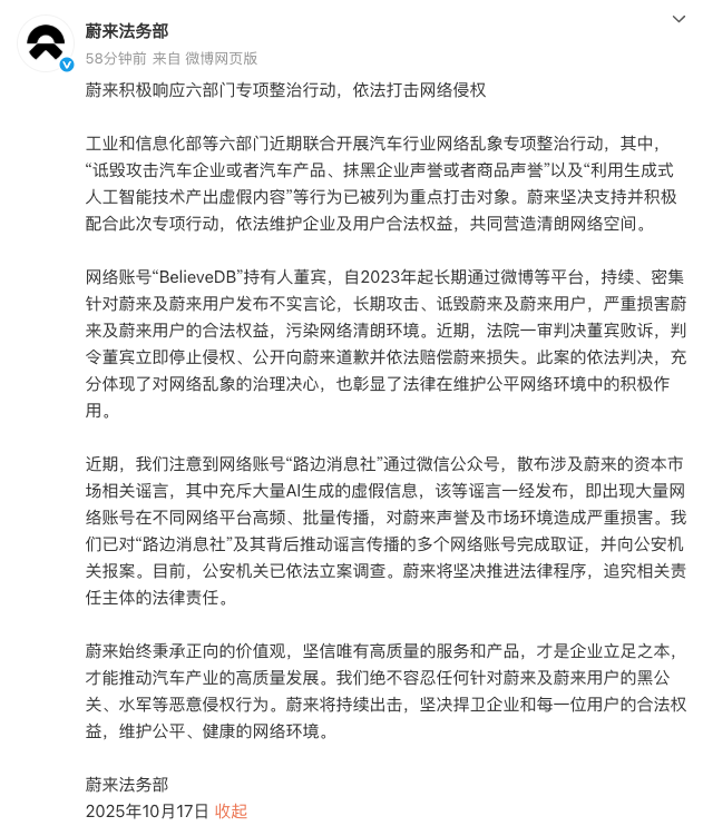 2025年10月17日,蔚来法务部通过官方微博发布声明,明确表示将积极响应工业和信息化部等六部门联合开展的汽车行业网络乱象专项整治行动,以法律手段打击网络侵权行为,维护企业与用户合法权益。