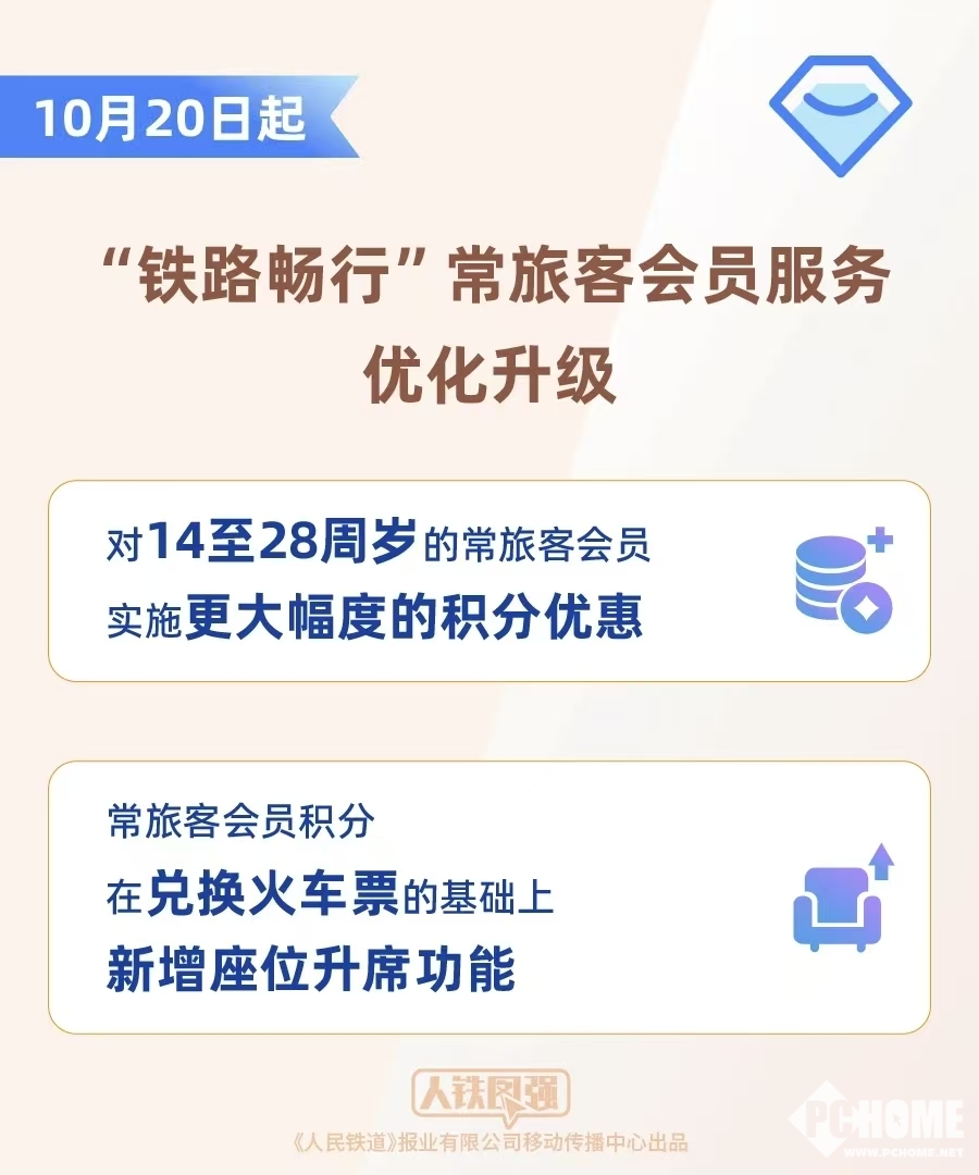 10月17日,中国国家铁路集团有限公司宣布,将于10月20日起优化升级“铁路畅行”常旅客会员服务,通过广大积分优惠范围与拓展积分应用场景,进一步提升旅客出行体验。