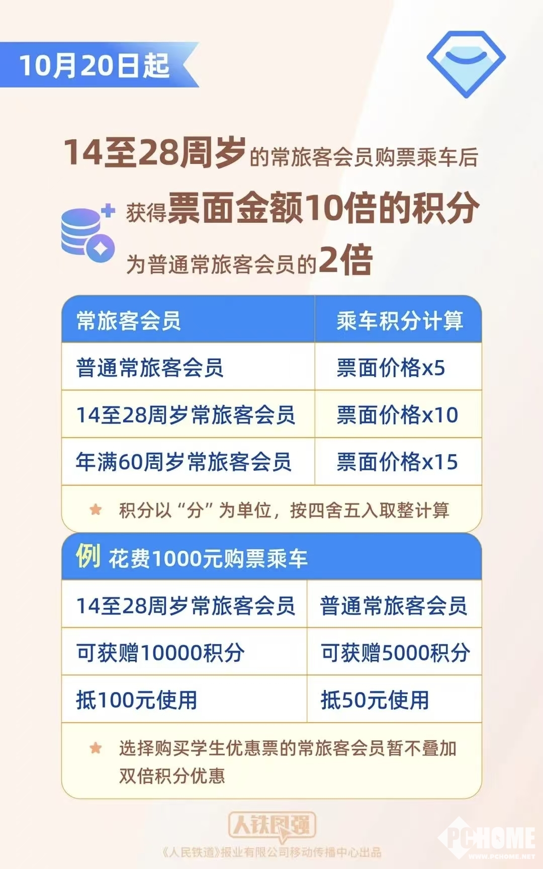 此次升级重点面向14至28周岁群体,符合条件的常旅客会员购票乘车后将获得票面金额10倍的积分,为普通会员的两倍。按100积分低1元的兑换规则,若花费1000元购票,青年会员可获10000积分抵扣100元,但购买学生优惠票的会员暂不叠加该优惠。目前普通会员享5倍积分,60周岁以上老年会员已享15倍积分,形成差异化权益体系。