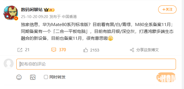 据独家信息,华为Mate 80系列与全新二合一平板电脑均备案11月上市。Mate 80标椎版有黑、白、青绿三色,首发鸿蒙OS 6及智能体功能;二合一平板提供皓月银、深空灰配色,将与手机实现鸿蒙跨设备无缝协同。