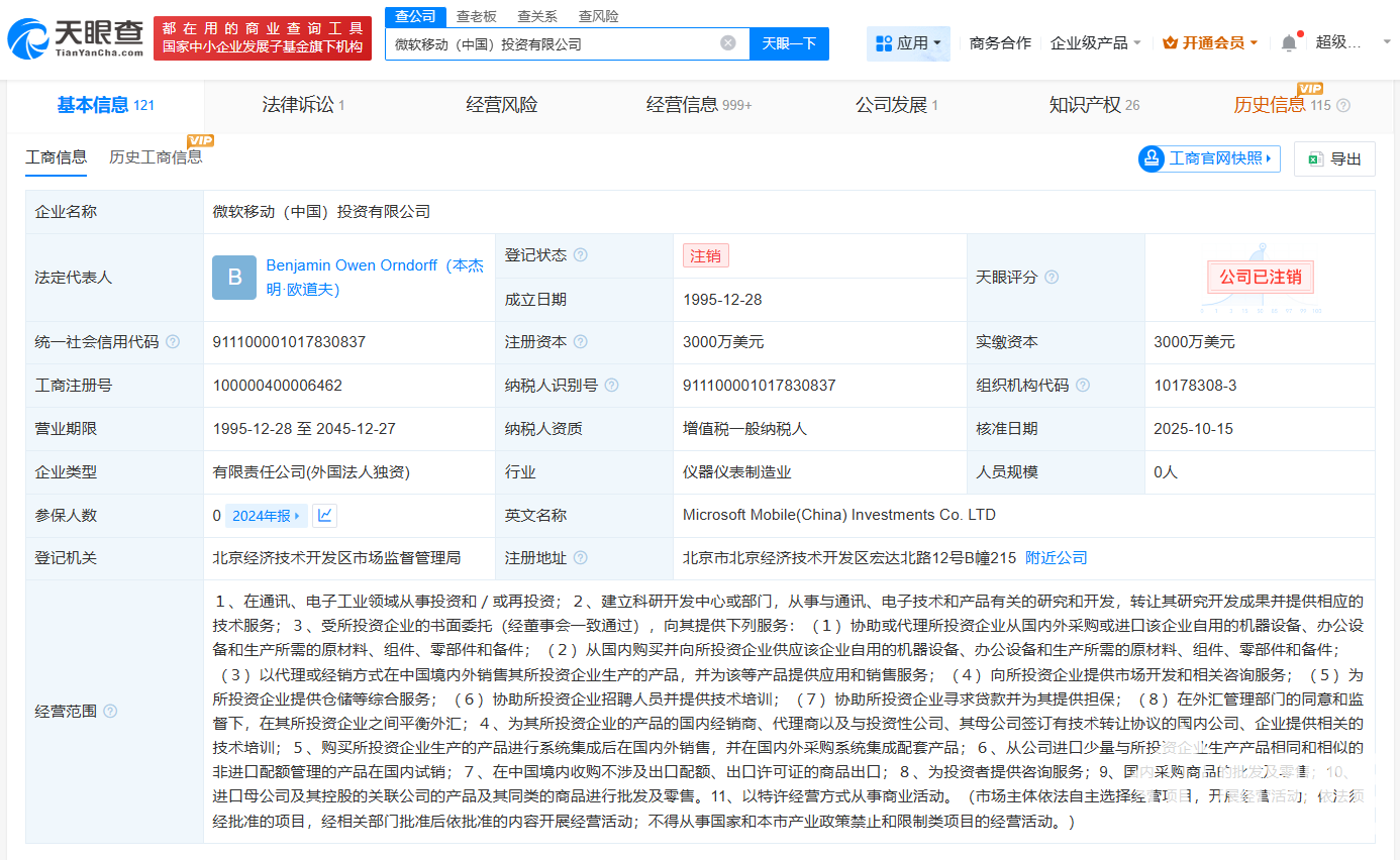 近日,天眼查App显示,微软移动(中国)投资有限公司登记状态由存续变更为注销。该公司成立于1995年12月,法定代表人为Benjamin Owen Orndorff(本杰明·欧道夫),注册资本3000万美元。