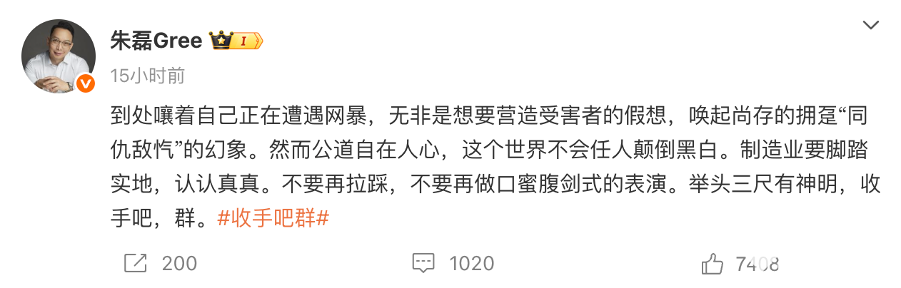 2025年10月20日,格力市场总监朱磊疑似内涵雷军,表示“制造业要脚踏实地,认认真真。不要再拉踩,不要再做口蜜腹剑式的表演。举头三尺有神明,收手吧,群。”雷军有“雷不群”的称号,朱磊疑似用“群”代指雷军。