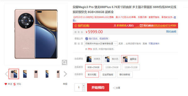 8月12日晚,荣耀发布了Magic3系列、荣耀平板 V7 Pro以及荣耀手表GS 3。作为Magic系列回归之作,Magic3系列一直备受关注。目前,荣耀Magic3 Pro的京东预约人数已经高达81.8万多,考虑到距离正式发售还有一周时间,最终预约量或轻松超过百万。