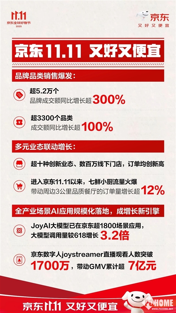 10月20日,京东官方宣布,“双11”活动迎来爆发,超5.2万个品牌成交额同比增长超300%,超3300个品类成交额同比增长超100%。