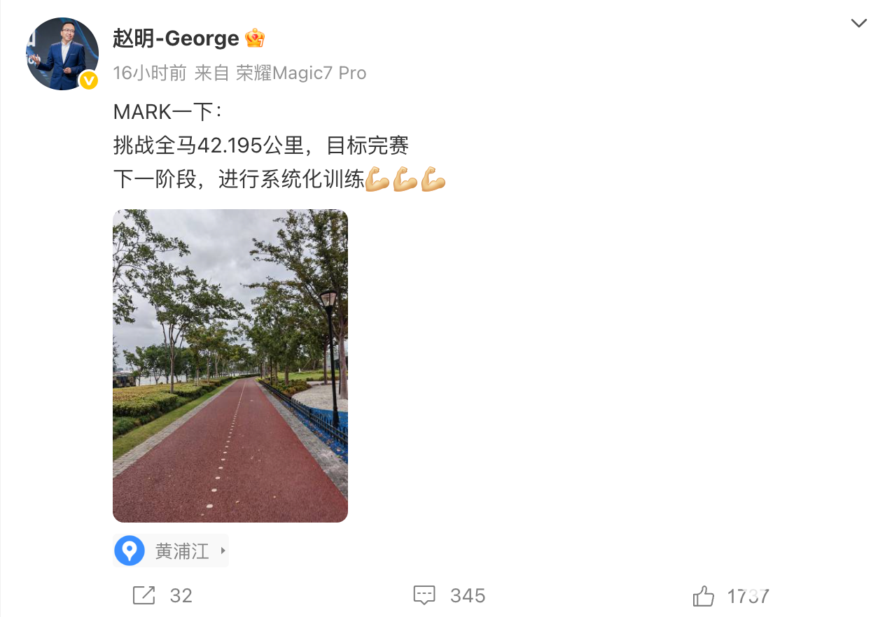 近日,前荣耀CEO赵明发布了2025年以来的首条微博,“MARK一下:挑战全马42.195公里,目标完赛。下一阶段,进行系统化训练”。