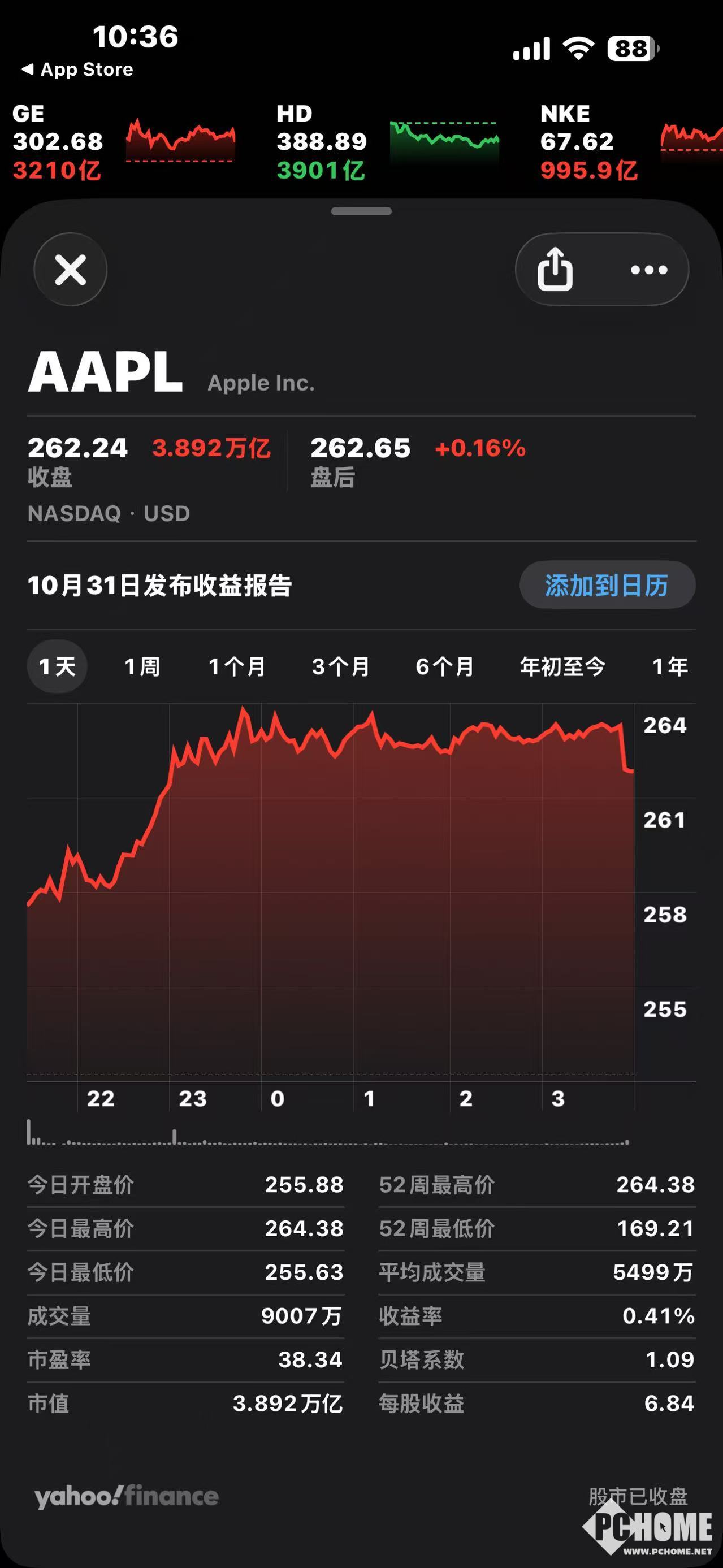 苹果股价创历史新高,报259.7美元,涨幅百分之三,总市值达3.85万亿美元。