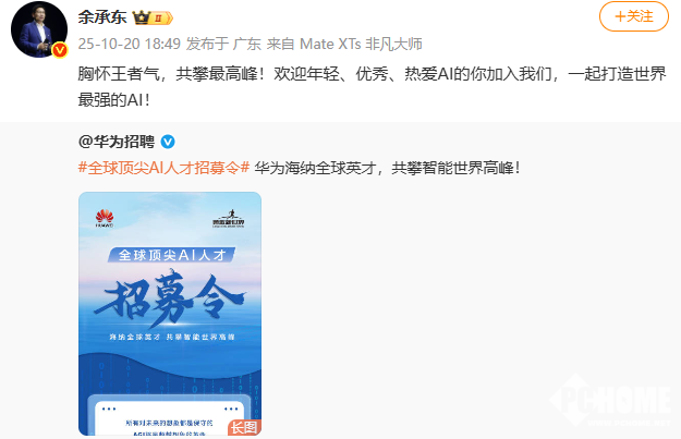 2025年10月21日消息,近日,华为招聘官方发布“全球顶尖AI人才招募令”,华为海纳全球英才,共攀智能世界高峰。华为常务董事、终端BG董事长转发并称,胸怀王者气,共攀最高峰!欢迎年轻、优秀、热爱AI的你加入我们,一起打造世界最强的AI。